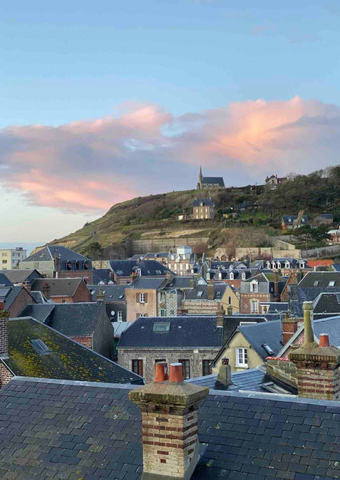 Au deuxième étage, cet appartement offre une vue dégagée sur les toits d’Étretat et la chapelle.